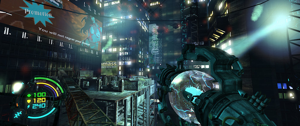 Regen prasselt auf die menschenleere Straße, blinkende Leichtreklamen spiegeln sich in den Pfützen, irgendwo um die Ecke höre ich ein metallisches Scheppern und schon rauscht eine Horde kleiner, wieselflinker Roboter um die Ecke. Ich reiße meinen Blaster hoch und schicke prasselnde Energiekugeln in Richtung der kleinen Biester, worauf sie in einem Funkenregen zerplatzen. Offensichtlich haben sie aber vorher noch um Hilfe gerufen, denn schon vibriert der Boden unter den mächtigen Schritten zweier riesiger Roboter, die sich von meinen coolen Energiekugeln nicht beeindrucken lassen. Ich klicke hektisch durch mein Waffenarsenal und wähle einen Raketenwerfer, der langsam aber sicher die gewünschte Wirkung zeigt. Immer wieder wechsle ich die Deckung um dem feindlichen Kugelhagel zu entgehen, sammle noch schnell bitter benötigte Munition auf und schaffe es buchstäblich mit der letzten Kugel, die beiden Stahlungetüme in einen Haufen Schrott zu verwandeln. Aufatmend laufe ich durch die qualmenden Trümmer und sammle allerlei Munition und Lebensenergie ein, die meine Gegner fallen gelassen haben.